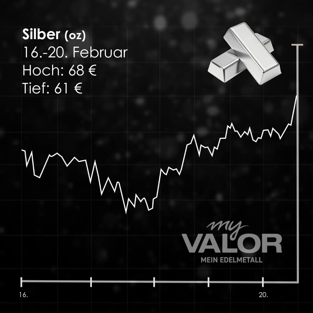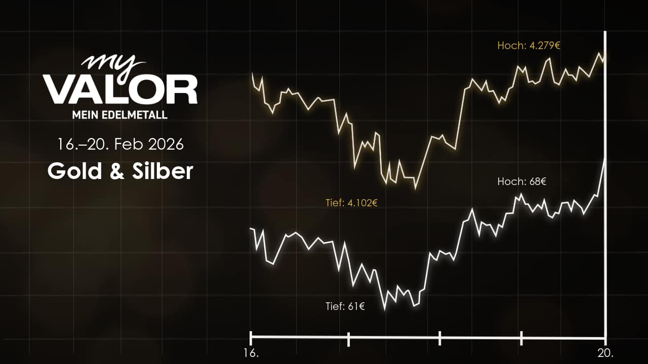 Gold bewegt sich derzeit in einem Korridor zwischen 4.850 $ und 5.100 $ pro Feinunze. Trotz kurzzeitiger Rücksetzer unter die psychologisch wichtige Marke von 5.000 Dollar Mitte der Woche, konnte sich das gelbe Metall bis zum 20. Februar wieder auf rund 5.026 $ (13 Uhr) circa 4.264 € erholen.